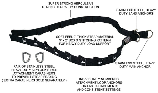 Our straps are made from herculean strength material that is thick and soft. The stainless steel anchor rings are thick and strong. Quality construction is designed to prevent strap fraying when used with our stainless steel keylock style carabiners. High quality combined with unmatched versatility.